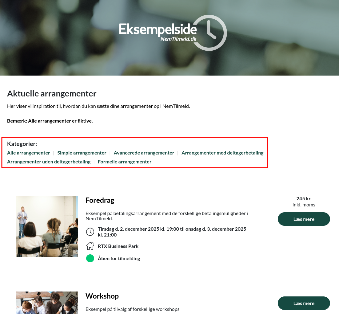 NemTilmeld giver dig mulighed for at inddele dine arrangementer i forskellige kategorier, hvis du har valgt, at arrangementerne skal være synlige på jeres offentlige liste over aktuelle arrangementer.