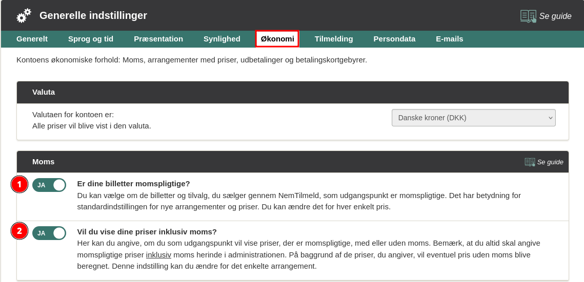 Det er vigtigt, at du angiver om deltagerbetalingen til dine arrangementer er momspligtig eller ej. Det har indflydelse på de fakturaer, som NemTilmeld sender ud på dine vegne.