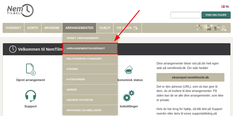 Herefter finder du oversigten over arrangementer under Arrangementer->Arrangementsoversigt.
