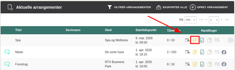Find arrangementet, som du vil tilføje til en eksisterende serie, i oversigten og klik på rediger-ikonet ud for arrangementet.