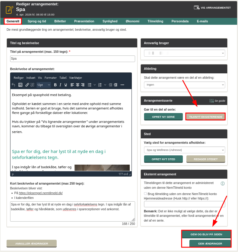 Find derefter afsnittet ”Arrangementserie" under fanen "Generelt". Her kan du vælge "Tilknyt eksisterende" og den ønskede serie fra listen. Herefter gemmer du nederst til højre.
