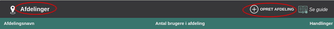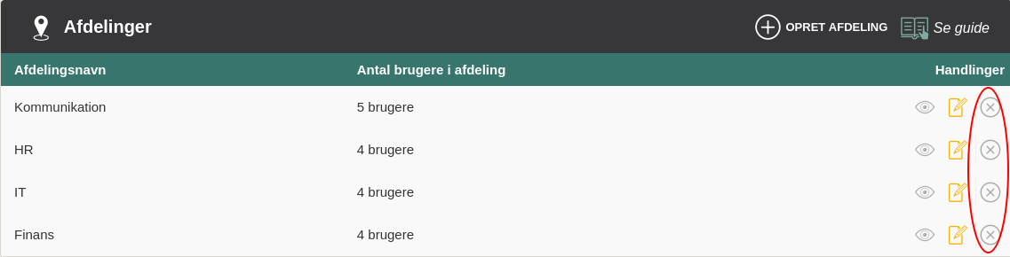 Hvis du ikke længere har brug for en afdeling, kan du deaktivere den ved krydset til højre under "Handlinger". Eventuelle brugere og arrangementer allerede tilknyttet til afdelingen vil i så fald miste denne tilknytning.