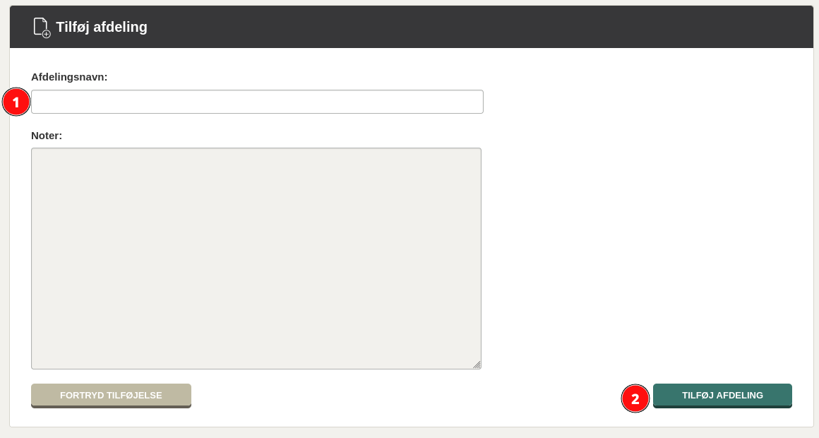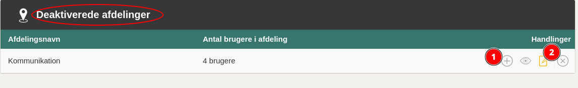 Under "Deaktiverede afdelinger" har du mulighed for at aktivere afdelingen igen ved plusset (1) eller slette afdelingen helt ved krydset (2):