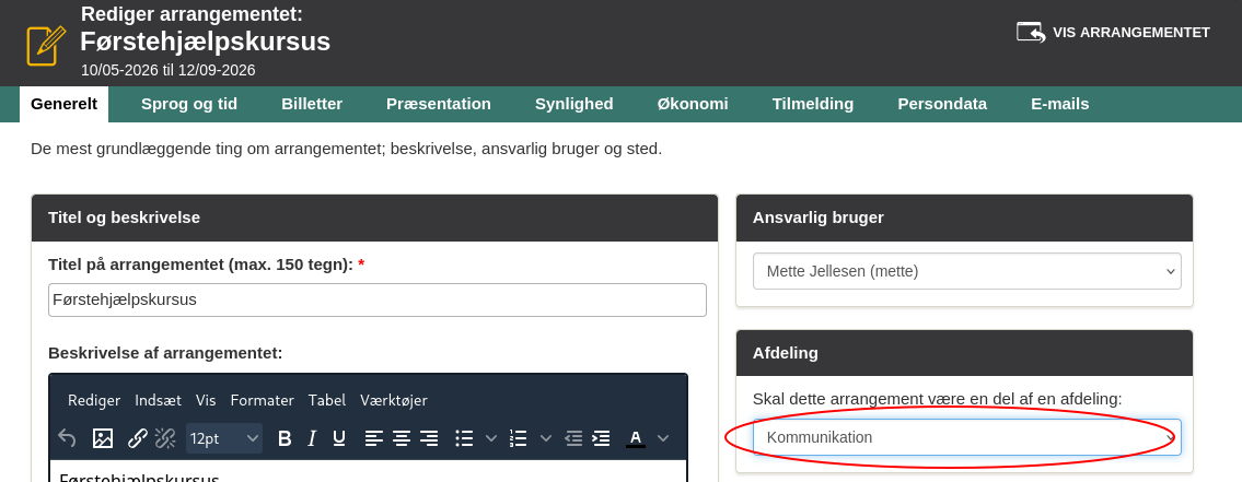 Hvis arrangementet, som brugeren skal have adgang til, allerede er oprettet, skal du huske at knytte arrangementet til afdelingen. Det gør du ved redigere arrangementet og blive i fanen "Generelt", hvor du kan vælge hvilken afdeling, arrangementet skal være i. Husk at gemme i nederste højre hjørne.