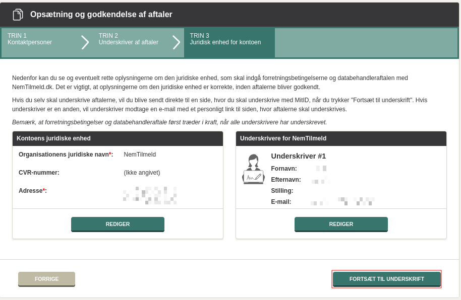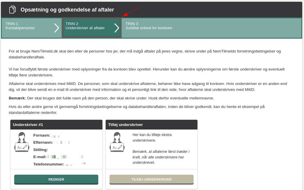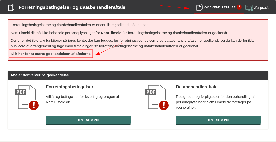 For at kunne modtage tilmeldinger gennem NemTilmeld , skal I godkende NemTilmelds forretningsbetingelser og databehandleraftale.