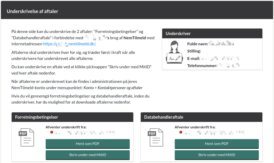 Aftalerne kan en administrator på kontoen sende til underskrift inde fra administration. Når aftalerne er sendt til underskrift, får den person, der skal underskrive aftalerne, en mail med et link til at se og underskrive aftalerne via MitID.