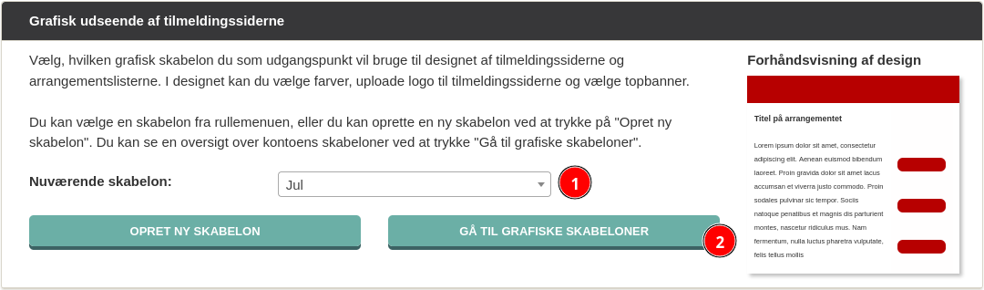Her kan du se, hvordan du arbejder med det grafiske udseende i NemTilmeld. Vi viser dig, hvordan du vælger et farvetema, samt hvordan du selv kan tilpasse elementer som logo, banner og farver på knapper og links på de forskellige tilmeldingssider og arrangementslister, som dine deltagere ser.