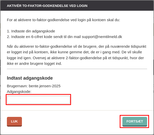 Når først du har aktiveret to-faktor-godkendelse på jeres konto, vil brugerne på kontoen kun kunne logge ind, hvis de har adgang til den mail, deres bruger er registreret med.