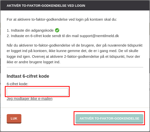 Når de har gjort det, modtager de en 6-cifret kode på mail, der er gyldig i 30 minutter. Denne kode skal brugeren indtaste for at logge ind.