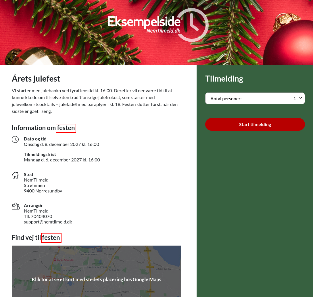 For eksempel kan du vælge at bruge ordet "fest" i stedet for "arrangement", så ordet passer til den type arrangement, du holder. Ordet vil blive erstattet forskellige steder på tilmeldingssiderne, for eksempel her: