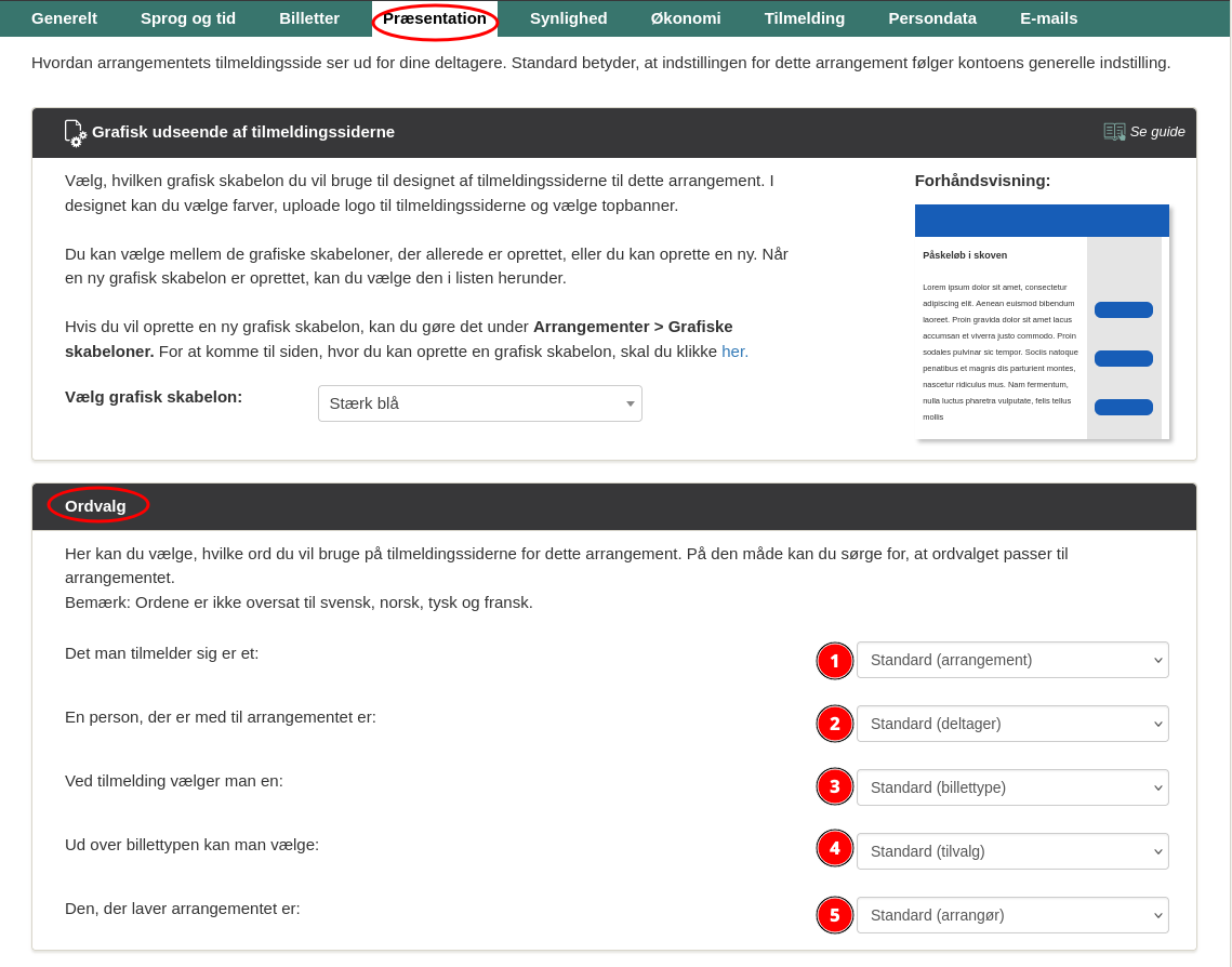 Du kan vælge at erstatte bestemte ord på tilmeldingssiderne for et enkelt arrangement med andre ord, end de ord I generelt bruger for jeres konto. På den måde kan du tilpasse ordlyden til det enkelte arrangement.