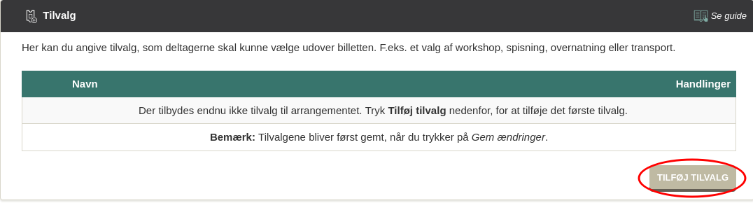 Et tilvalg er et ekstra valg, som deltageren skal eller kan træffe sammen med tilmeldingen. Det kunne være valg af workshop, transport, overnatning eller lignende, hvor hver deltager skal vælge imellem nogle fastsatte muligheder. Du kan både oprette gratis tilvalg samt tilvalg, der koster noget.