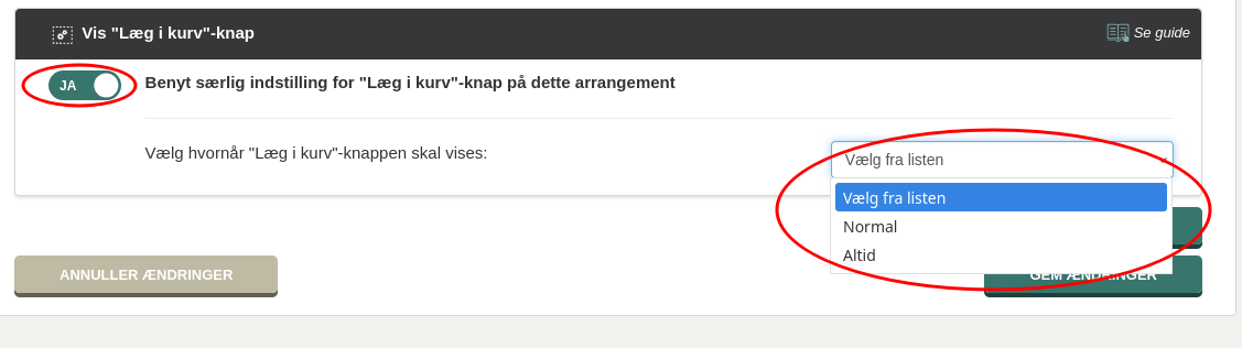 Du kan vælge at benytte en særlig indstilling for ”Læg i kurv”-knappen på siden, hvor du redigerer et arrangement.![]()
