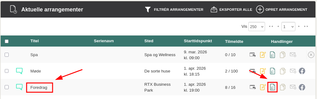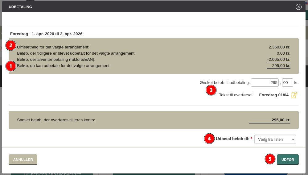 Bemærk: De enkelte arrangementer har ikke deres eget regnskab. Kontoen har én samlet saldo. Refunderinger, indbetalinger og udbetalinger fra et enkelt arrangement kan derfor medvirke, at den præcise omsætning for et andet arrangement ikke kan udbetales eller, at en refundering ikke kan blive gennemført, før der er tilstrækkelig dækning på saldoen igen.
