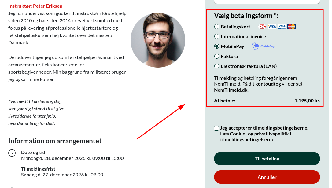 Deltagerne kan nu vælge mellem de valgte betalingsmetoder, når de tilmelder sig.
