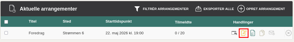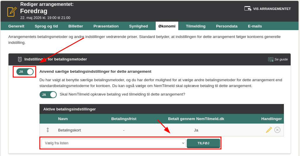 Du ændrer i betalingsmetoderne for et enkelt arrangement på siden, hvor du redigerer arrangement.