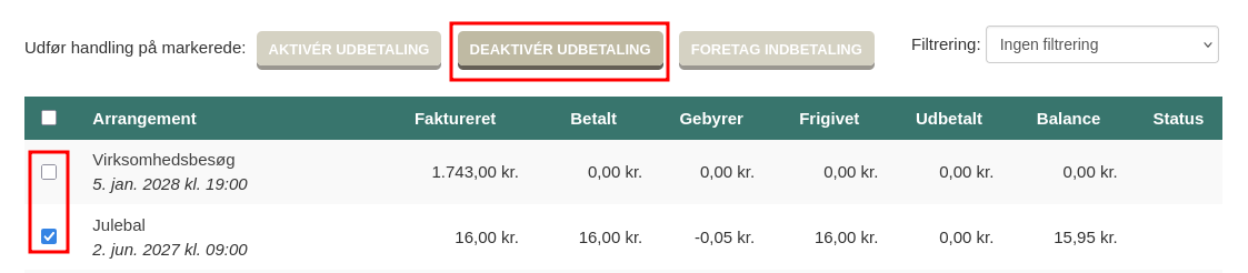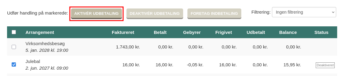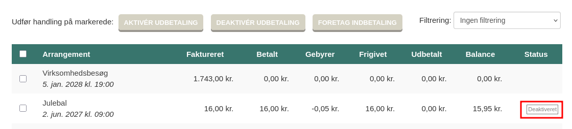 Når du trykker på "Deaktivér udbetaling", bliver arrangementerne markeret med "Deaktiveret" i sidste kolonne i tabellen.