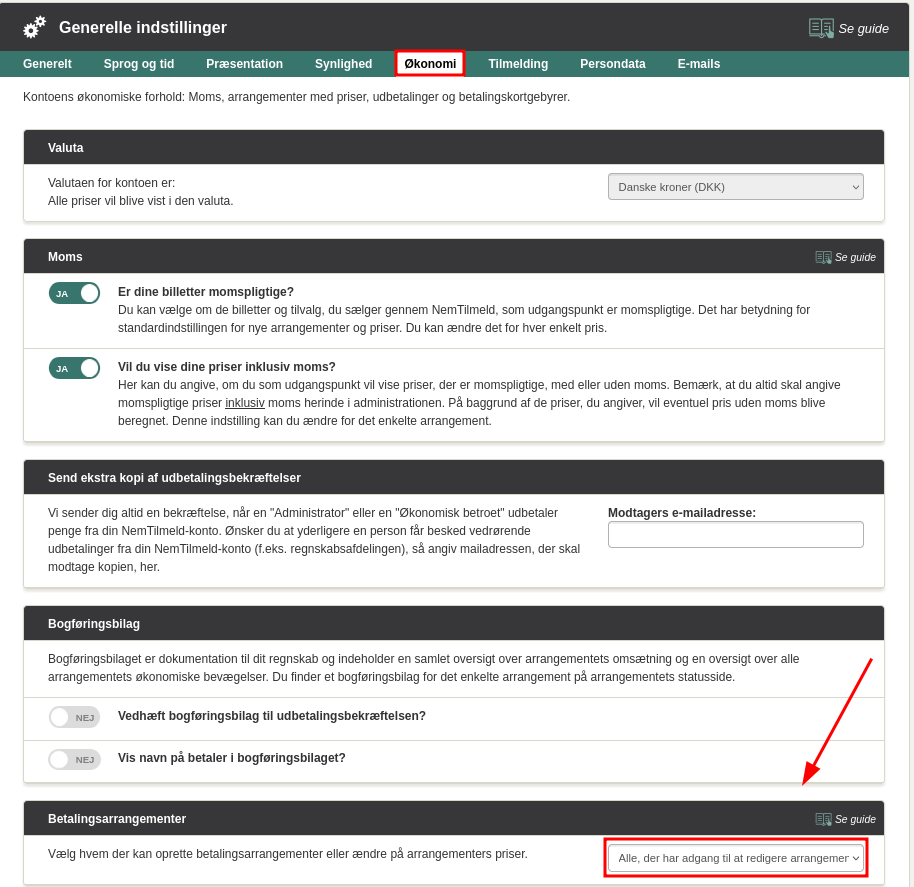 Brugere med rettighederne "Administrator" eller "Økonomisk betroet" kan indstille, hvem der må oprette arrangementer med billettyper eller tilvalg, der koster noget (højere end 0 kr.). Indstillingen bestemmer også, hvem der må ændre priser på billettyper eller tilvalg, der er oprettet.