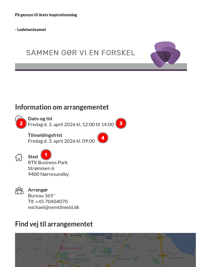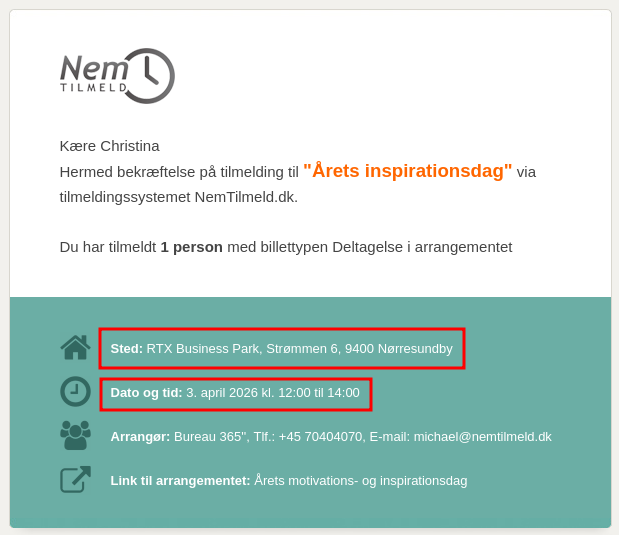 Du har mulighed for at vælge om startdato, slutdato, tilmeldingsfrist og sted skal være synlige på dine arrangementers tilmeldingsside og bekræftelsesmail.
