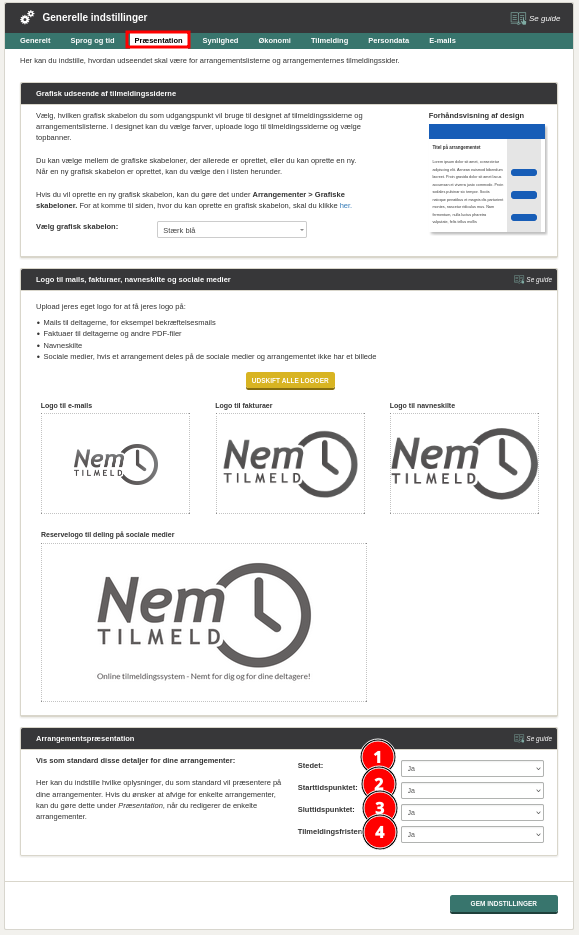 Bemærk, at du kan ændre indstillingen for et enkelt arrangement, når du redigerer det, hvis du ønsker, at det enkelte arrangement skal afvige fra standarden. Se hvordan her.